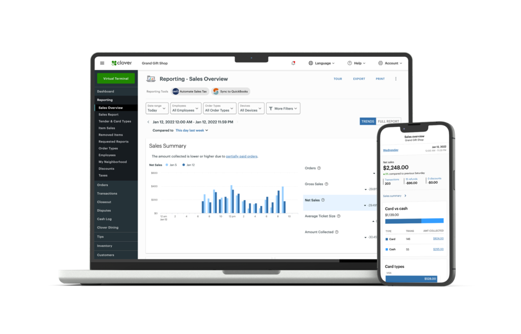 Realiza un seguimiento de tus ventas, gestiona el inventario y envía recibos digitales directamente desde la aplicación de Clover. Todo lo que necesitas para tu negocio, en la palma de tu mano.